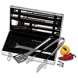 Includes grill brush tongs spatula 12 corncob holders fork basting brush and 4 skewers all packed in an aluminum storage case measuring 18-5/8" x 10" x 3-1/8". Limited lifetime warranty. 8.50 Open Stock Value. Gift boxed.- Aluminum Storage Case Measures 18-5/8" x 10" x 3-1/8"