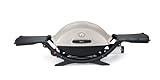 The Weber Q 220 gas grill has electronic ignition for easy, reliable lighting, an infinitely adjustable burner valve with a high-quality regulator, 2 durable Tuck-Away work tables with built-in tool holders (tools sold separately) which conveniently fold and store inside the grill, sturdy glass-reinforced nylon grill frame, cast aluminum lid and body, removable catch pan, a tall lid profile with a built-in thermometer, a large weather-resistant lid handle, a porcelain-enameled cast-iron cooking grate, and operates on a standard 14.1 or 16.4-ounce propane cylinders (sold separately). Includes Weber Q recipe booklet. Tubular stainless steel burner, 12,000 BTU-per-hour input, 280-square-inch total cooking area. Limited 5-year warranty.- The Weber Q220 gas grill has an electronic ignition for easy use and has 280-square-inches of cooking area